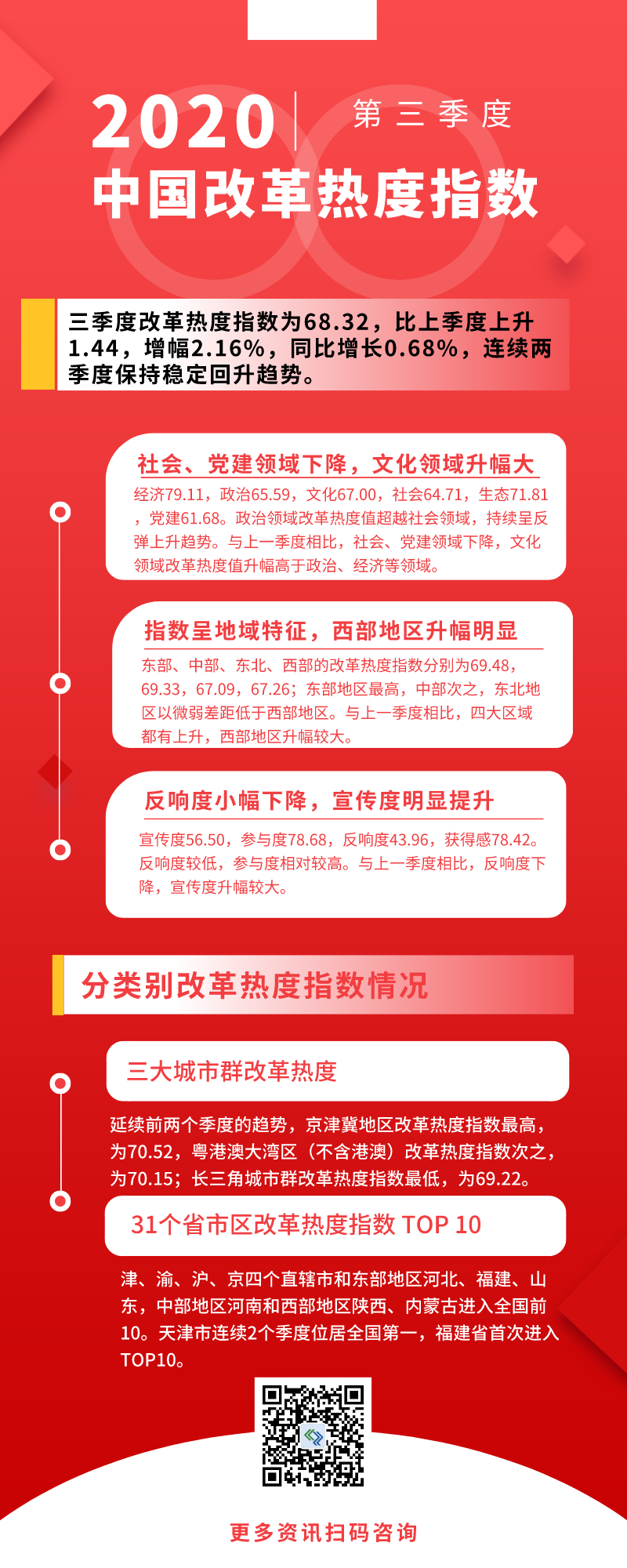 2018年11月25日,中國經(jīng)濟(jì)體制改革研究會在“第十六屆中國改革論壇”上首次發(fā)布《改革熱度指數(shù)——中國改革熱度第三方評估報告》,發(fā)布內(nèi)容為2018年第三季度中國改革熱度指數(shù),具體包括我國整體指數(shù)以及分省、分地區(qū)、分城市、分領(lǐng)域、分維度指數(shù),并將改革熱度指數(shù)總體報告呈送中央深改委,同時向各省深改委,以及有需求的城市改革辦提供各自熱度指數(shù)詳情報告。