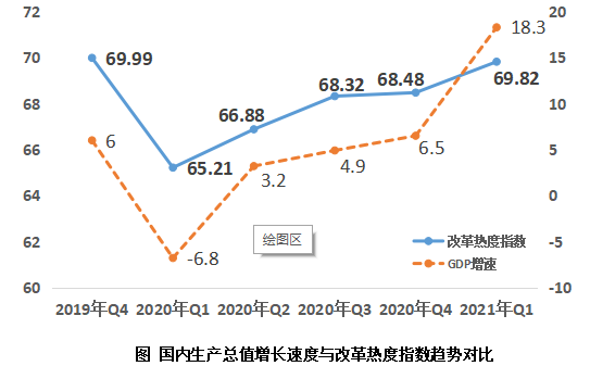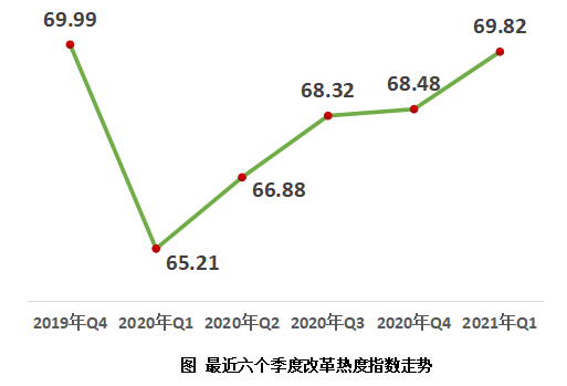 4月21日,中國(guó)經(jīng)濟(jì)體制改革研究會(huì)在京發(fā)布《2021年第一季度改革熱度第三方評(píng)估報(bào)告》。報(bào)告顯示,2021年第一季度改革熱度指數(shù)為69.82,比上一季度增加1.34,連續(xù)4個(gè)季度保持穩(wěn)定回升態(tài)勢(shì);比去年同期增加4.61,已經(jīng)基本接近疫情前2019年第4季度69.99的水平。