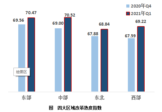 2、中西部地區(qū)引領(lǐng)指數(shù)回升趨勢(shì)。從四大區(qū)域來(lái)看,東部、中部、東北、西部的改革熱度指數(shù)分別為70.47,70.52,68.84,69.22;中、西部地區(qū)指數(shù)增幅超越東部。從排名來(lái)看,中部地區(qū)超越東部地區(qū),名列第一;西部地區(qū)小幅超越東北地區(qū)位居第三,東北地區(qū)墊底。